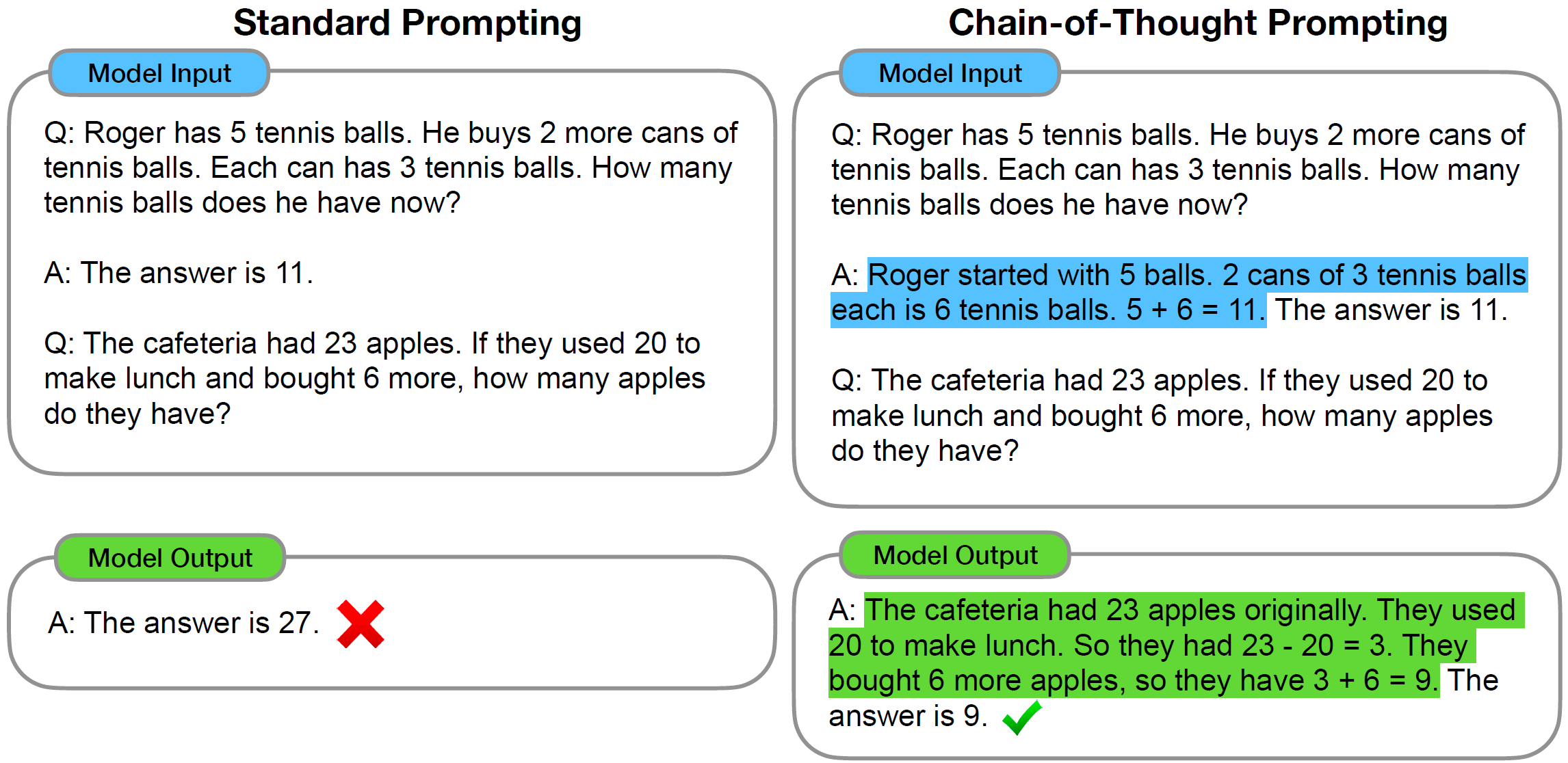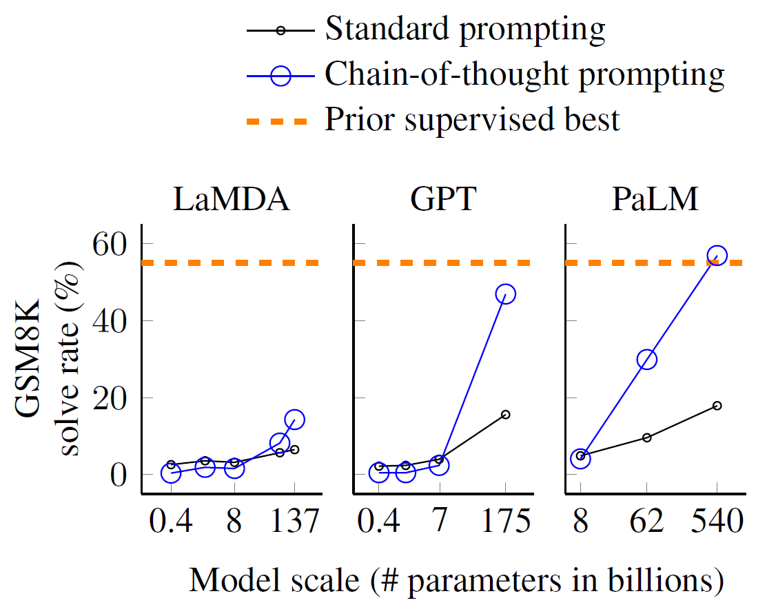 这种in-context learning也启示我们输入的prompt的重要性。一种十分常见的技术叫Chain-of-Thought (CoT) prompting,在prompt的提供例子里,如果我们并不仅只给出答案,而是额外提供思考过程,更有可能得出正确的答案。下面的图来自论文《Chain-of-Thought Prompting Elicits Reasoning in Large Language Models》,第一个图给出了示意,第二个图表明CoT是随模型尺寸增大而显现的性质。当CoT也来到zero-shot时,例如不提供任何推理例子,直接说Let’s think step by step或First等,也是有可喜的效果的,比裸zero-shot要好得多。在实践中,prompt engineering是一门颇具技巧性的学问。